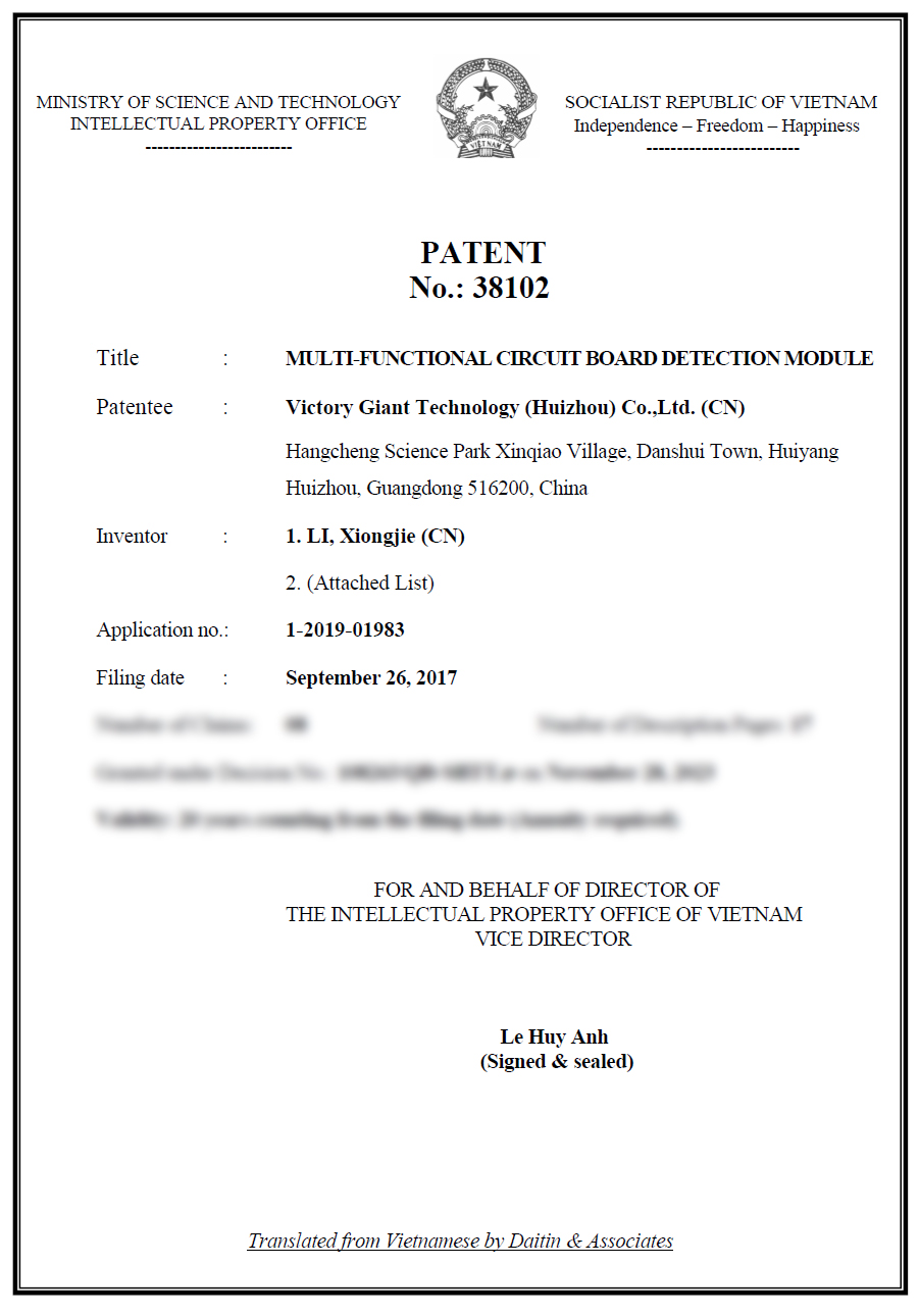 近日,我司兩項專利“PCT/CN2017/103329一種多功能線路板檢測模塊及檢測方法” 、“PCT/CN2017/094434一種不同板料混壓的高頻板制作方法”榮獲越南PCT國際發明專利授權。